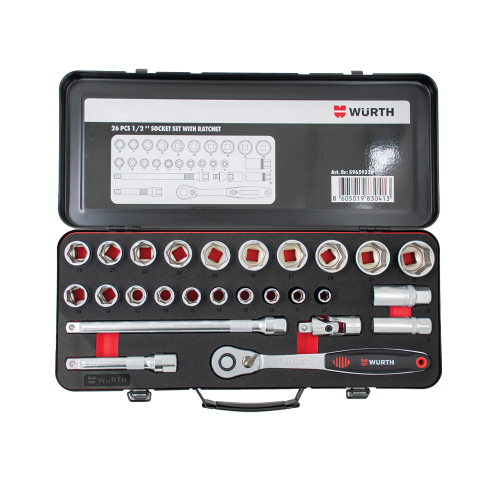 Set 1/2'' nasadnih ključeva sa slim račnom, sastavljen od 26 precizno izrađenih djelova, idealan za rad u skučenim prostorima. Spakovan u čvrstu metalnu kutiju sa zaštitnim neoprenskim ulošcima.